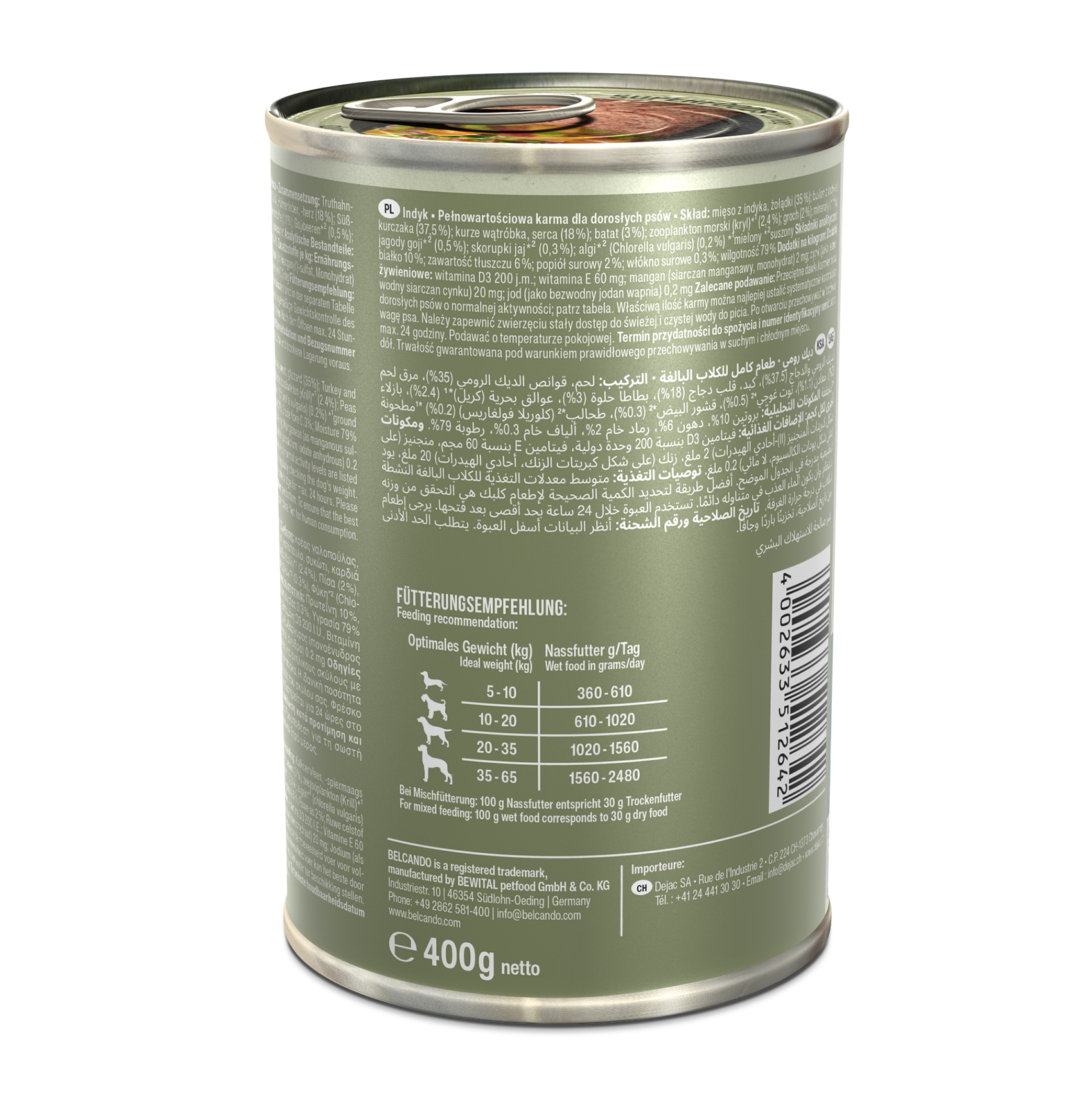 Truthahnfleisch, -muskelmagen (35 %); Fleischbrühe von Truthahn und Huhn (37,5 %); Hühnerleber, -herz (18 %); Süßkartoffeln (3 %); Meeres-Zooplankton (Krill)*¹ (2,4 %); Erbsen (2 %); Mineralstoffe (1,1 %); Gojibeeren*² (0,5 %); Eierschalen*² (0,3 %); Algen*² (Chlorella vulgaris) (0,2 %) *¹gemahlen *²getrocknet