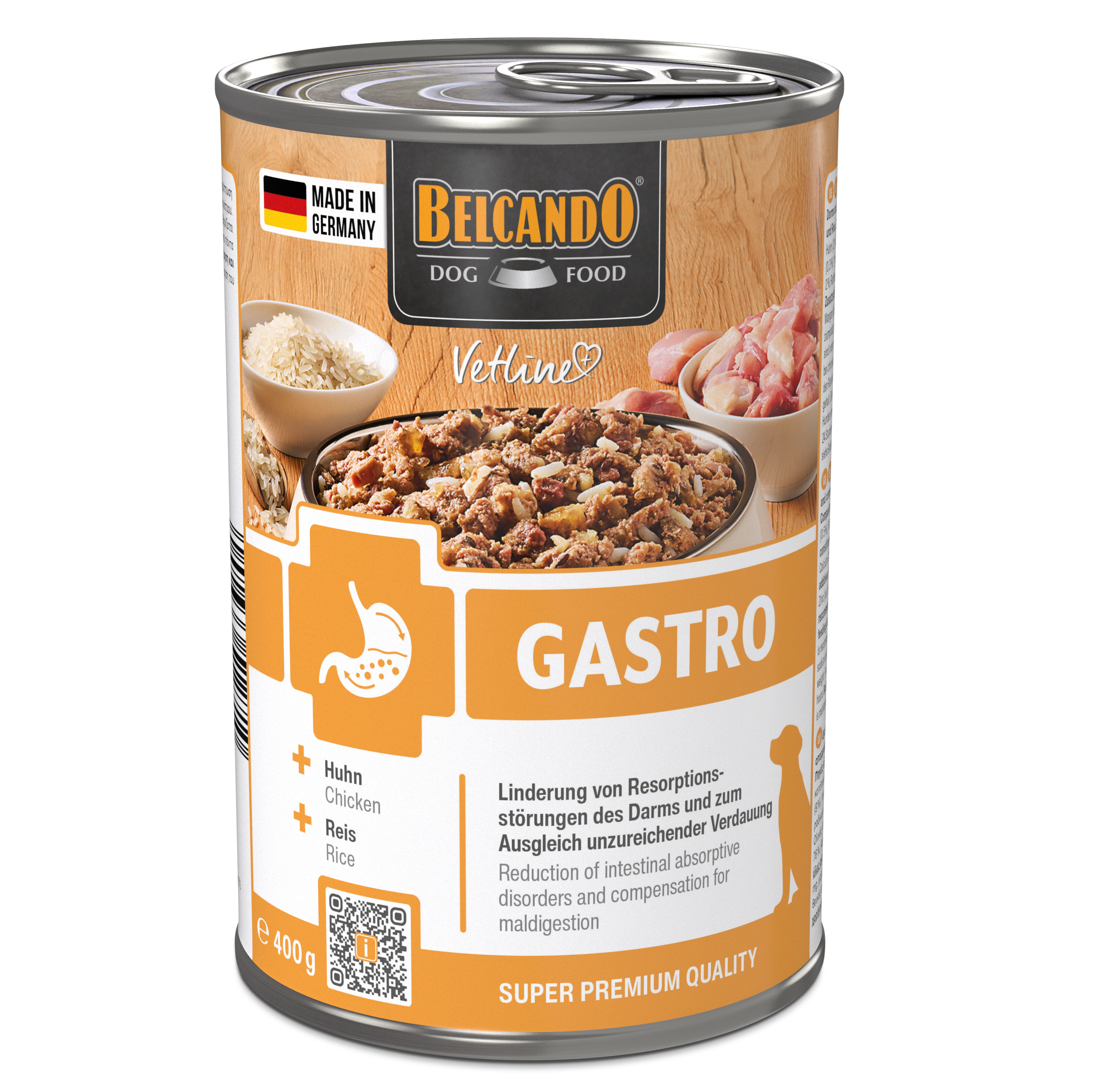 BELCANDO Vetline Gastro – schmeckt gut, tut gut! Für wen ist Vetline Gastro geeignet? Für Hunde, für die der Tierarzt aufgrund einer Magen-Darm-Erkrankung die Umstellung auf ein entsprechendes Diätfutter empfiehlt sowie für Hunde, die aufgrund kurzzeitiger Verdauungsbeschwerden wie Erbrechen und/oder Durchfall eine Schonkost bekommen sollen. Im Laufe eines Hundelebens können verschiedene gesundheitliche Herausforderungen auftreten. Zu den häufigsten dieser Beschwerden gehört eine Magen-Darm-Erkrankung – ein Problem, das sich durch die gezielte Verwendung von Spezialfutter wie Vetline Gastro wieder in den Griff bekommen lässt. Was die BELCANDO Vetline von anderen Diät-Alleinfuttermittel unterscheidet? Die Verwendung garantiert bester Zutaten mit Fokus auf Frische und Ausgewogenheit für den besten Geschmack! Dazu gehören wertvolle Superfoods wie Leinsaat, Reis und frisches Hühnerfleisch. Zudem bietet die Vetline die Wahl: Nassfutter, Trockenfutter – oder beides zusammen? Beide Futterarten sind optimal auf die Bedürfnisse ernährungssensibler Hunde abgestimmt. Damit die Umstellung möglichst reibungslos funktioniert, solltest Du Deine gewohnten Abläufe beibehalten. Wähle daher die Futterart, die Dein Hund schon vorher gewohnt war. Wenn Dein Hund Trocken- und Nassfutter gemischt am liebsten mag, kannst Du dies auch mit Vetline Gastro Nass- und Trockenfutter fortführen.