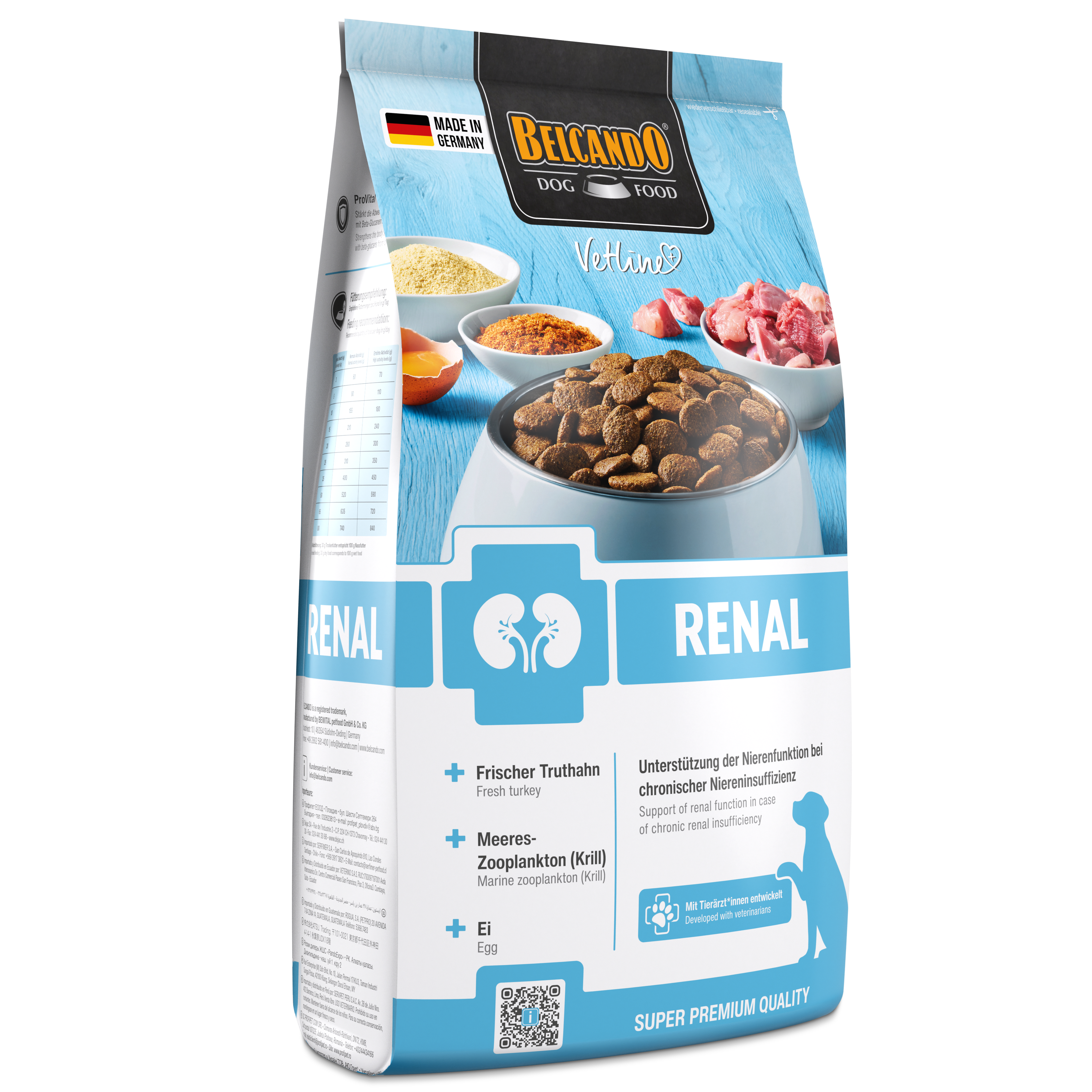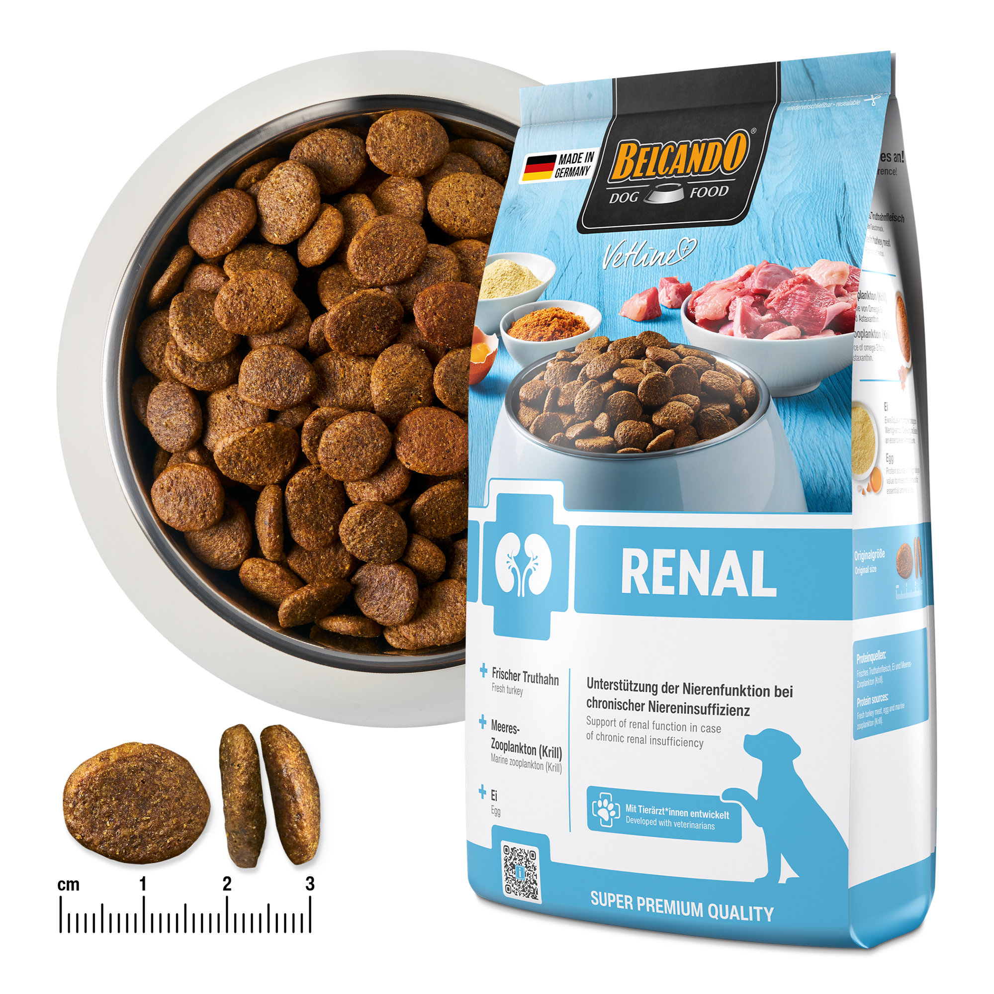 BELCANDO Vetline Renal – schmeckt gut, tut gut! Für wen ist Vetline Renal geeignet? Für Hunde, die die Diagnose „Niereninsuffizienz“ (akut/chronisch) erhalten haben und für die der Tierarzt die Umstellung auf ein entsprechendes Diätfutter empfiehlt. Im Laufe eines Hundelebens können verschiedene gesundheitliche Herausforderungen auftreten. Zu den häufigsten dieser Beschwerden gehört die Diagnose „Niereninsuffizienz“ – ein Problem, das sich durch die gezielte Verwendung von Spezialfutter wie Vetline Renal abmildern lässt. Was die BELCANDO Vetline von anderen Diät-Alleinfuttermittel unterscheidet? Die Verwendung garantiert bester Zutaten mit Fokus auf Frische und Ausgewogenheit für den besten Geschmack! Dazu gehören wertvolle Superfoods wie Krill, Ei und frisches Truthahnfleisch. Zudem bietet die Vetline die Wahl: Nassfutter, Trockenfutter – oder beides zusammen? Beide Futterarten sind optimal auf die Bedürfnisse nierenkranker Hunde abgestimmt. Damit die Umstellung möglichst reibungslos funktioniert, solltest Du Deine gewohnten Abläufe beibehalten. Wähle daher die Futterart, die Dein Hund schon vorher gewohnt war. Wenn Dein Hund Trocken- und Nassfutter gemischt am liebsten mag, kannst Du dies auch mit Vetline Renal Nass- und Trockenfutter fortführen.