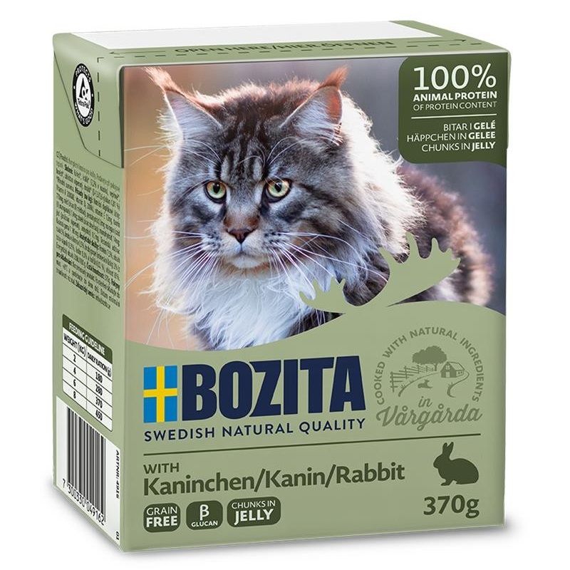 Bozita Häppchen in Gelee mit Kaninchen ist eine von zwölf leckeren, traditionellen schwedischen Geschmacksrichtungen. Eine komplette Katzennahrung für junge Kätzchen und erwachsene Katzen. Bozita Häppchen in Gelee wird in praktischen, umweltfreundlichen Verpackungen angeboten, die sich beim Öffnen und Schließen einfach bedienen lassen. Bozita wird aus qualitativ hochwertigen Rohstoffen wie Fleisch, Fisch, Meeresschalentieren und Eiern hergestellt. Das Produkt enthält weder Soja oder Getreide noch Konservierungsstoffe und es ist fettarm.