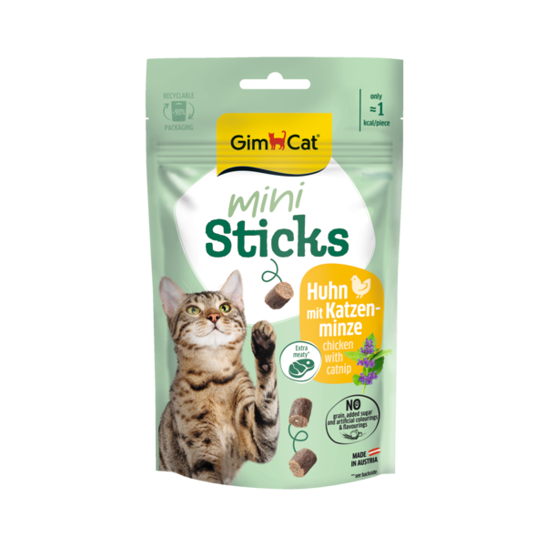 GimCat Mini Sticks mit Huhn & Katzenminze sind unwiderstehlich leckere Snacks mit hohem Fleischanteil für deine Katze!