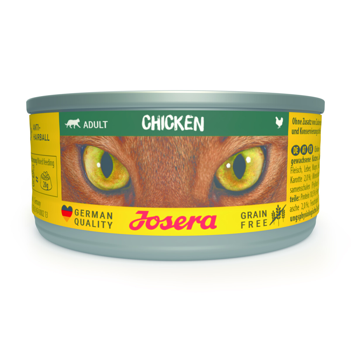 Mmmh, Abwechslung im Anmarsch! Mit unserem neuen Katzennassfutter-Sortiment aus der Dose sorgen wir für noch mehr Auswahl: Unser Josera Nassfutter Chicken wird Ihre Samtpfote mit leckerem Huhn überzeugen. Die getreidefreie Rezeptur wurde außerdem mit Lachsöl verfeinert – dieses liefert essenzielle Omega-3-Fettsäuren und schmeckt außerdem vorzüüüüglich.