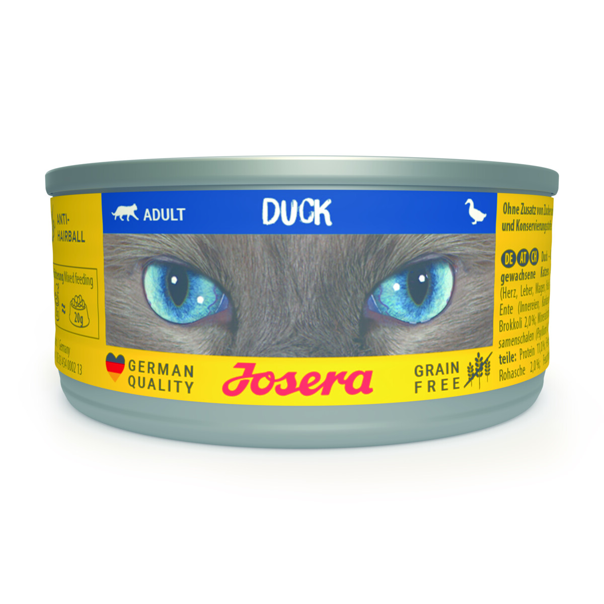 Wenn’s der Samtpfote schmeckt, sind wir Zweibeiner überglücklich, oder? Ein Grund mehr für leckere Abwechslung zu sorgen – zum Beispiel mit unserem neuen Josera Nassfutter Duck in der Dose! Der Geschmack von Ente wird auch trinkfaule oder mäkelige Miezen zum Futtern animieren und sie mit Flüssigkeit versorgen.