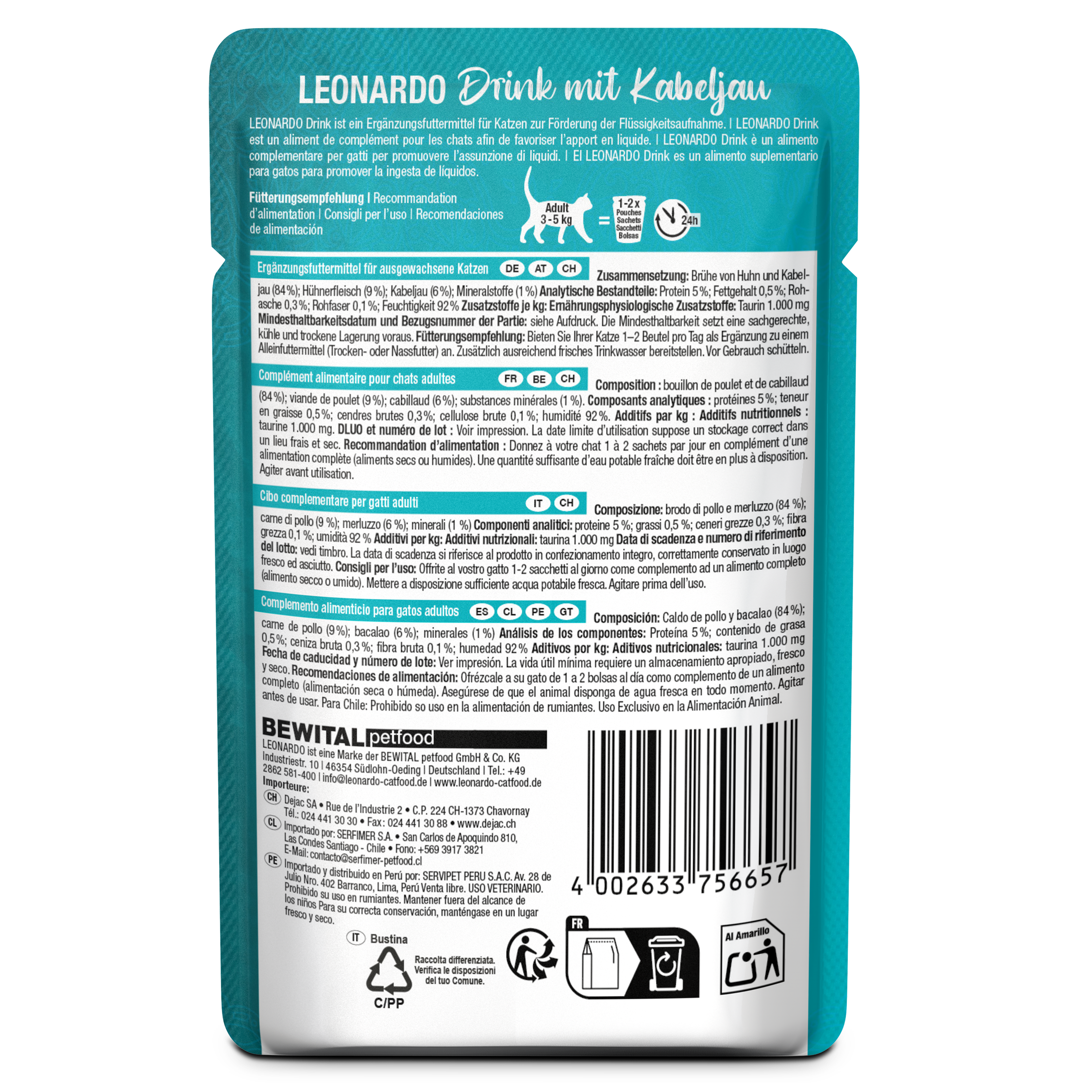Schmeckt nach Meer: Deine Katze ist ein kleiner Flüssigkeitsverweigerer? Dann lockt sie der LEONARDO Drink Atlantic cod mit seiner feinen Fischnote an den Napf! Und das ist gut so, denn besonders als Ergänzung zu Trockenfutter steigern die LEONARDO Drinks die Motivation zur Flüssigkeitsaufnahme. Damit wirken sie sich positiv auf Wohlbefinden und Vitalität aus, denn eine ausreichend hohe Flüssigkeitsaufnahme ist wichtig zur Unterstützung der Harnwegsfunktion.
