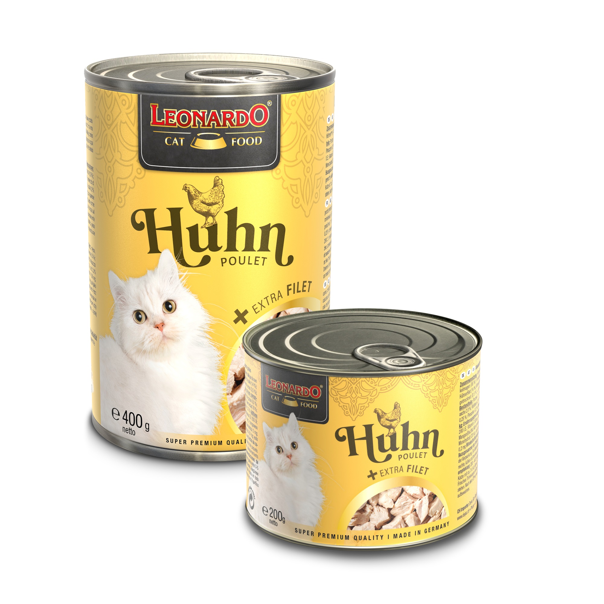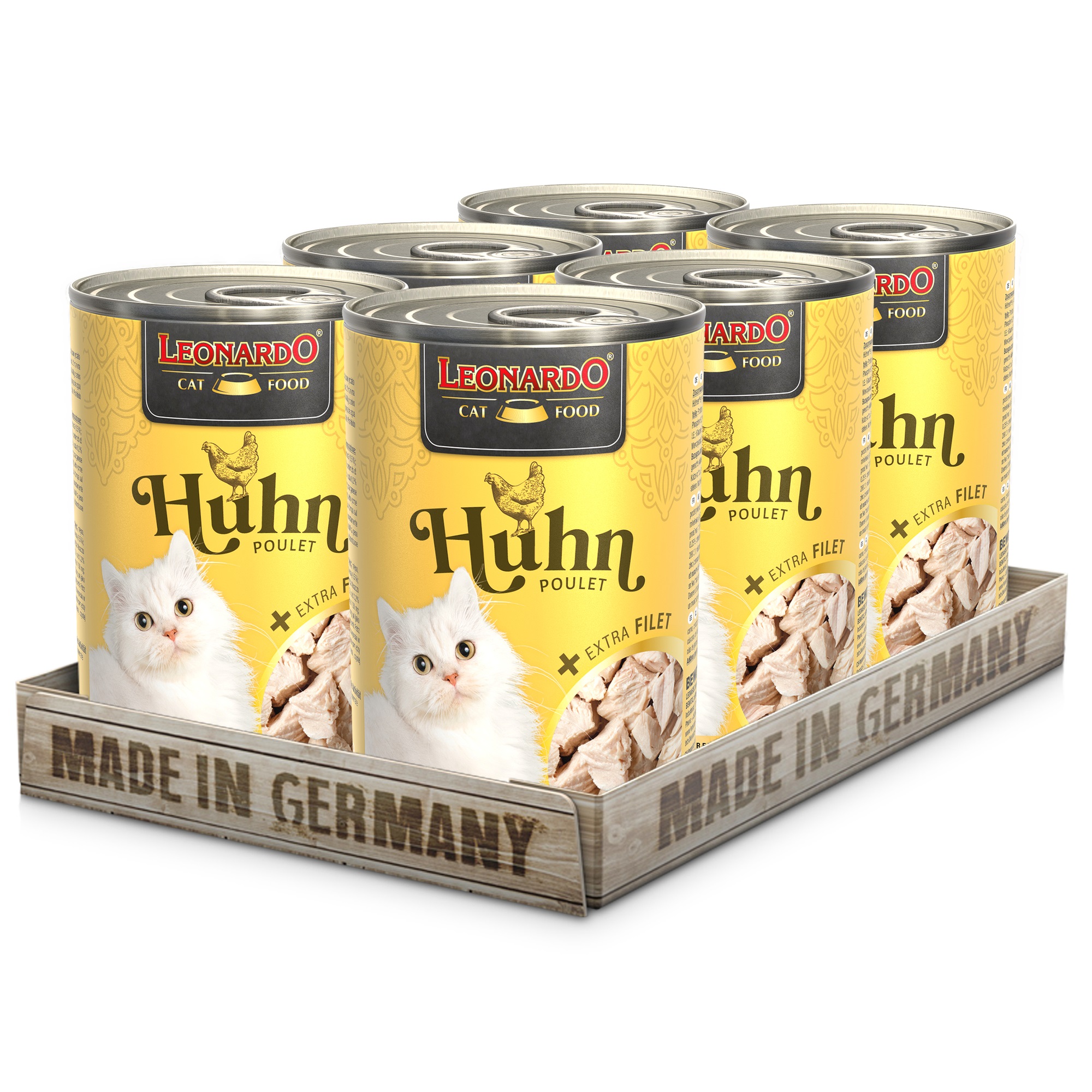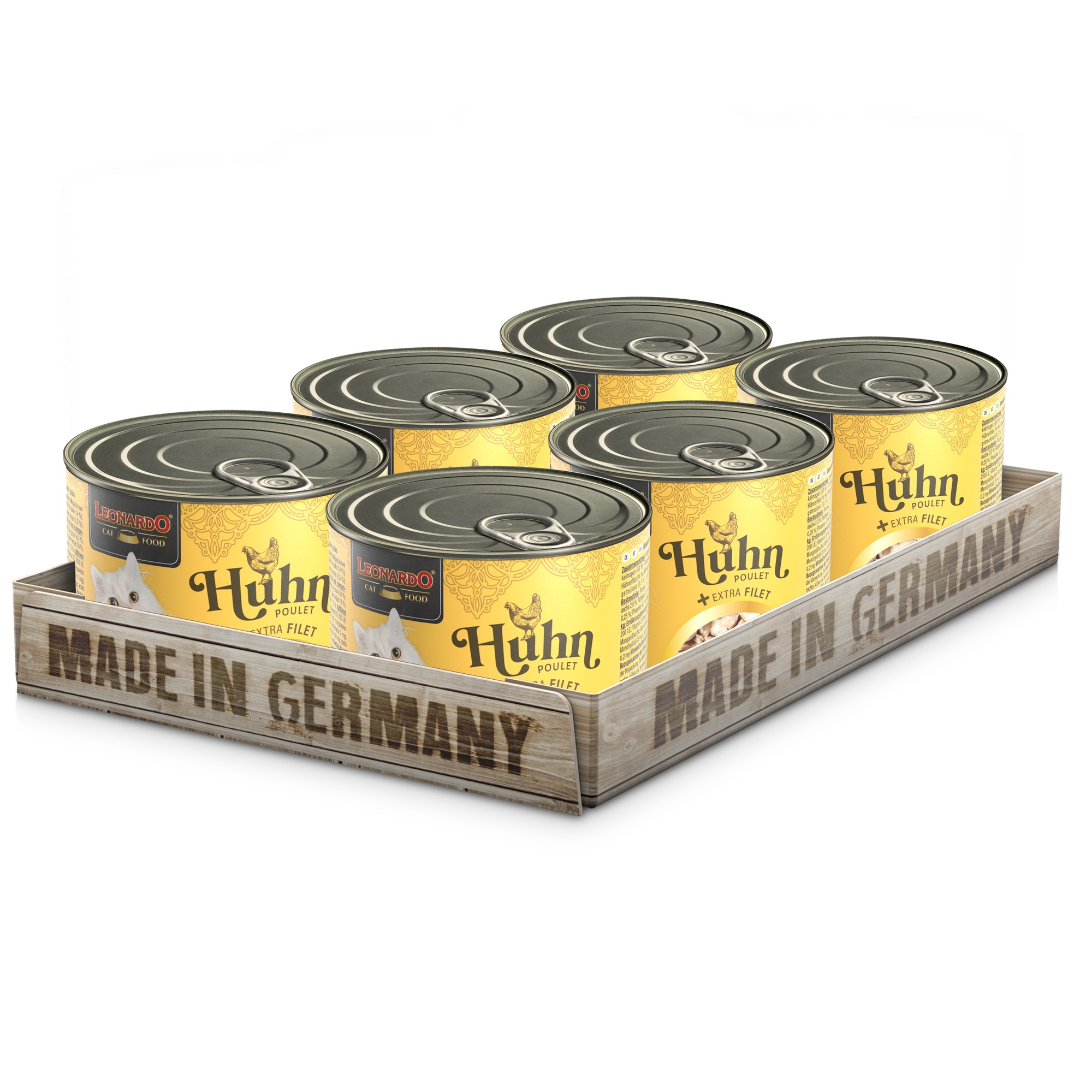 Hühnerfleisch, -leber, -herz, -muskelmagen (56 %); Fleischbrühe vom Huhn (28,8 %); Hühnerfilet (14 %); Mineralstoffe (0,5 %); Eierschalen, getrocknet (0,5 %); Lachsöl (0,2 %)