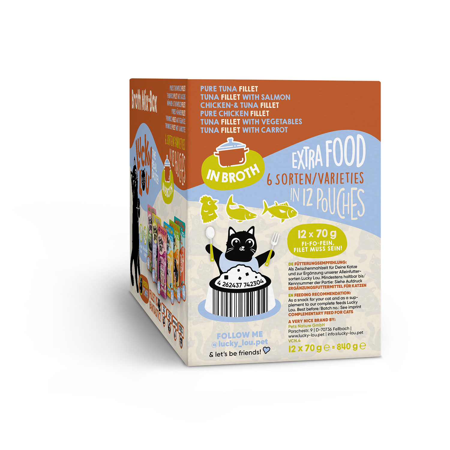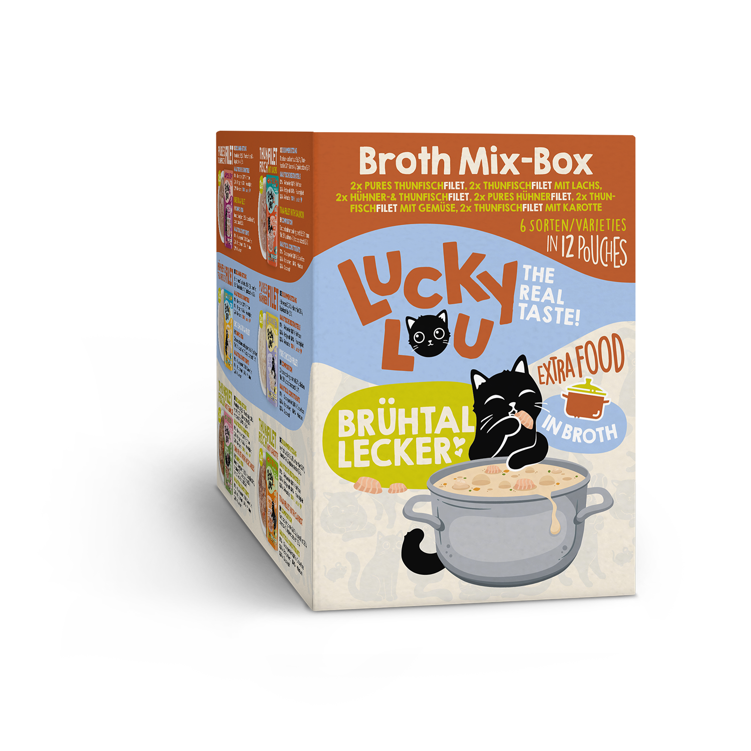 Die Lucky Lou® Extrafood Broth-Mix-Box 12 x 70g beinhaltet: