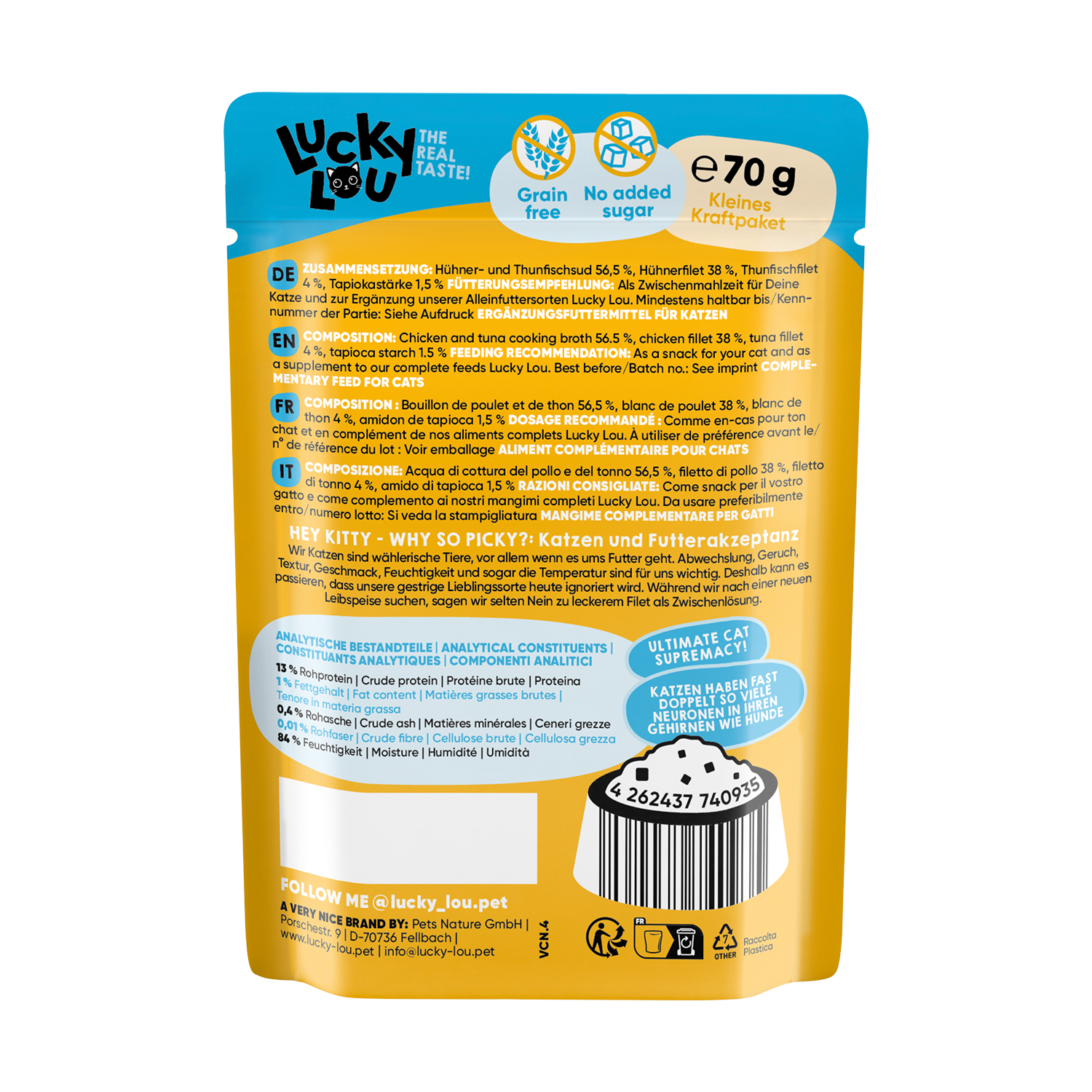 Verwöhne deine Samtpfote mit dem Lucky Lou® Extra Food Hühner- & Thunfischfilet in Sud – dem schmackhaften Ergänzungsfutter im 70g-Beutel. Es liefert wertvolle Nährstoffe und begeistert durch seinen unwiderstehlichen Geschmack. Ideal als kleiner Genussmoment zwischendurch oder zur Aufwertung der täglichen Mahlzeit.