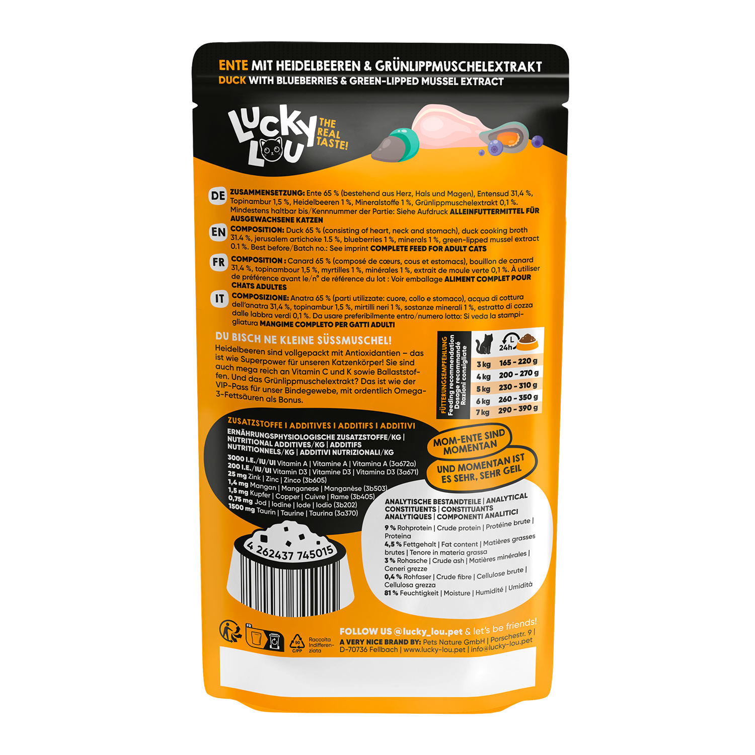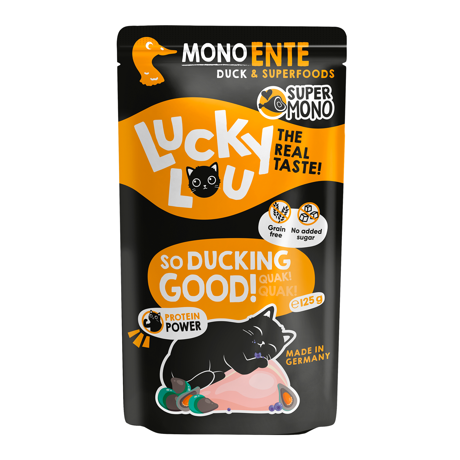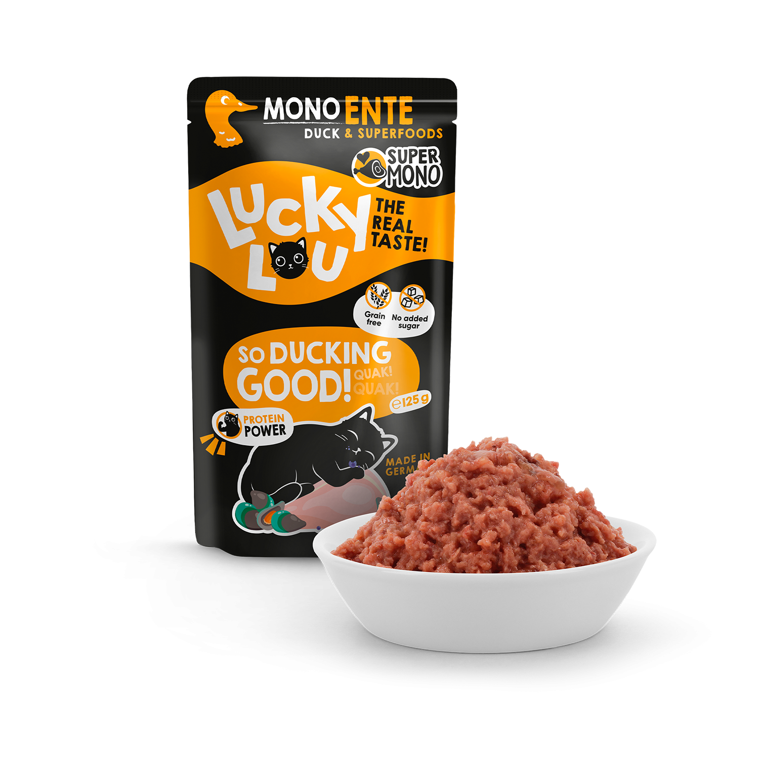 Lucky Lou® SuperMono Ente – Die ideale Wahl für sensible Katzenmägen. Dieses hochwertige Nassfutter wurde speziell für Katzen mit empfindlicher Verdauung entwickelt. Es enthält ausschließlich Huhn als einzige tierische Proteinquelle und ist somit besonders gut verträglich. Mit seinem hohen Nährstoffgehalt unterstützt Lucky Lou® SuperMono Ente das Wohlbefinden und die Gesundheit deiner Katze – Tag für Tag. Die feine Textur und der natürliche Geschmack sorgen für höchste Akzeptanz bei anspruchsvollen Vierbeinern. Setze auf bewährte Qualität und achte auf die besonderen Bedürfnisse deiner Katze – mit Lucky Lou® SuperMono Ente.