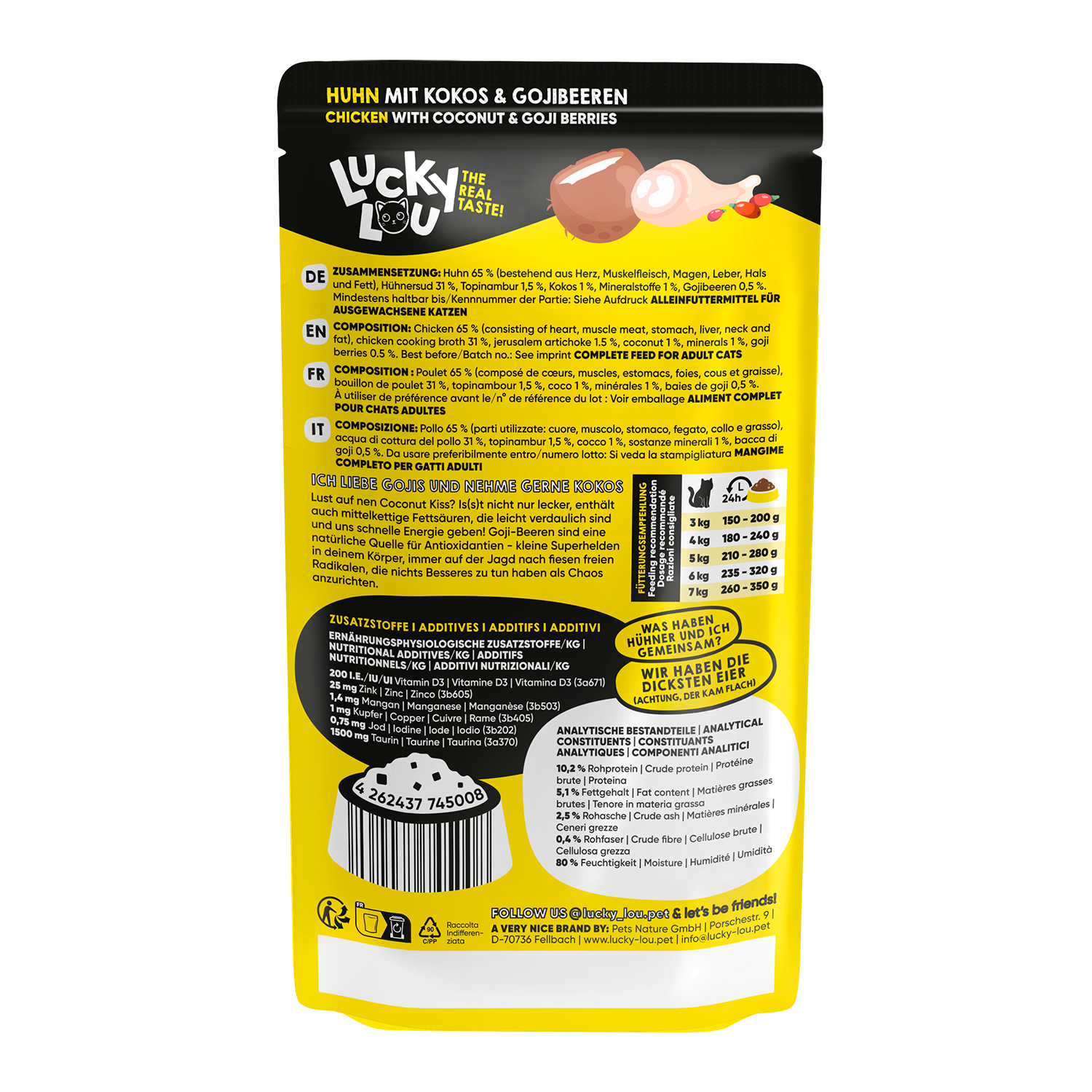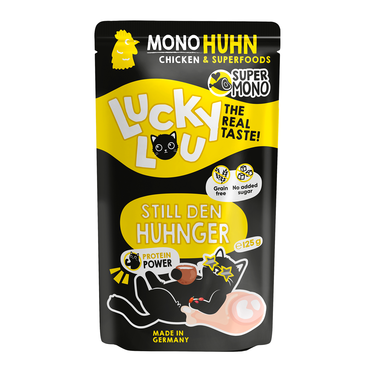 Lucky Lou® SuperMono Huhn – Die ideale Wahl für sensible Katzenmägen. Dieses hochwertige Nassfutter wurde speziell für Katzen mit empfindlicher Verdauung entwickelt. Es enthält ausschließlich Huhn als einzige tierische Proteinquelle und ist somit besonders gut verträglich. Mit seinem hohen Nährstoffgehalt unterstützt Lucky Lou® SuperMono Huhn das Wohlbefinden und die Gesundheit deiner Katze – Tag für Tag. Die feine Textur und der natürliche Geschmack sorgen für höchste Akzeptanz bei anspruchsvollen Vierbeinern. Setze auf bewährte Qualität und achte auf die besonderen Bedürfnisse deiner Katze – mit Lucky Lou® SuperMono Huhn.