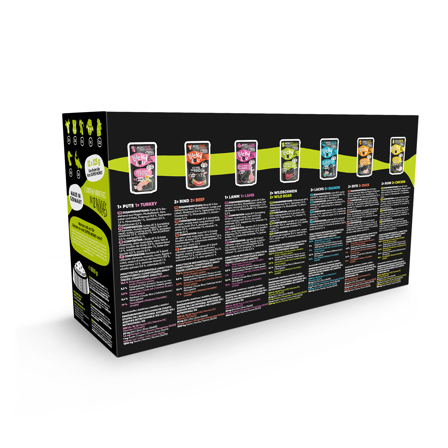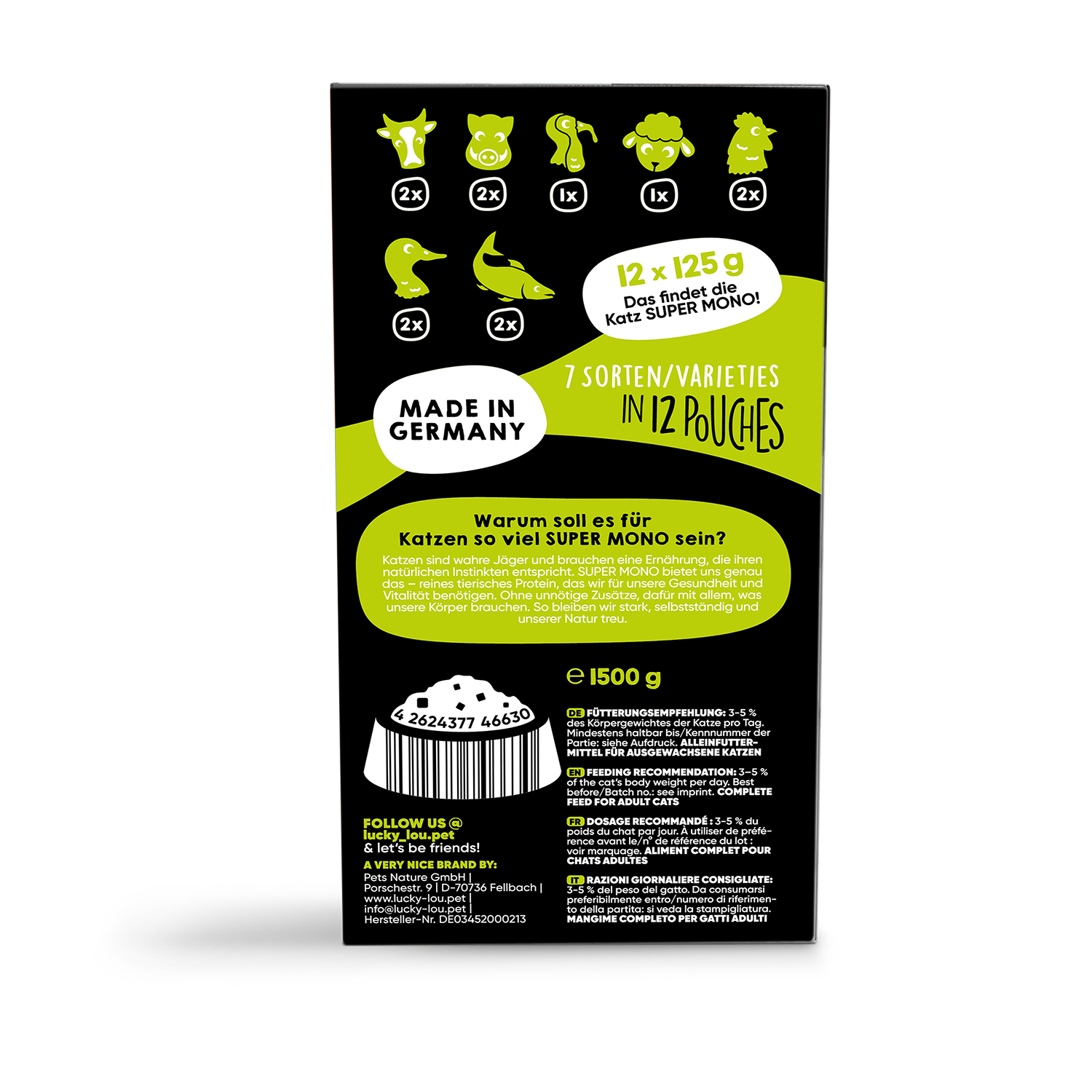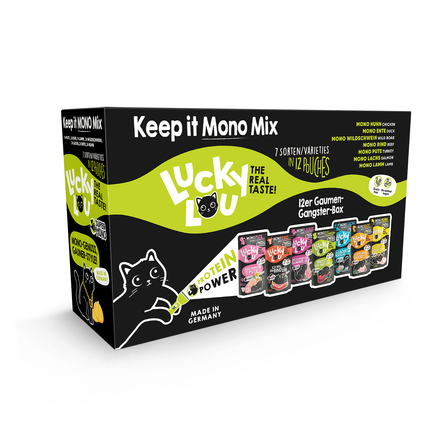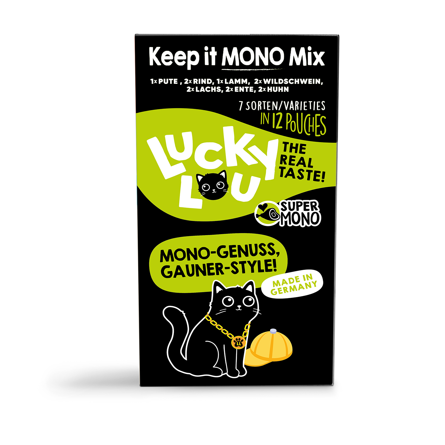 Langweiligen Einheitsfraß gibt’s woanders – Lucky Lou® SuperMono ist in 7 verschiedenen Sorten in 125g Pouches und 200g Dosen erhältlich.