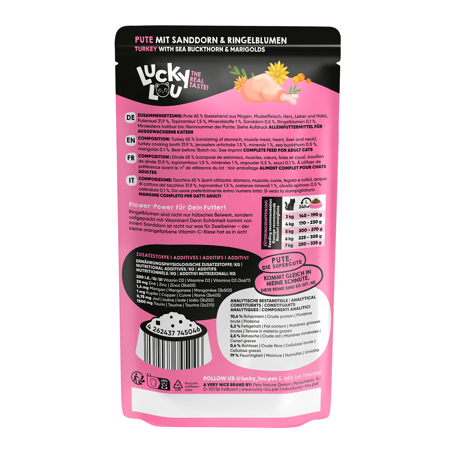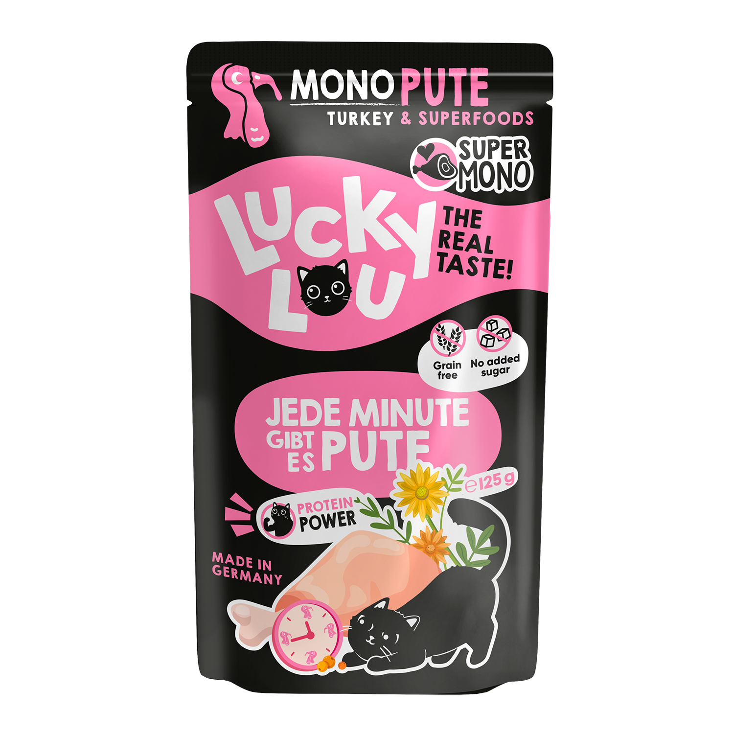 Das Lucky Lou® SuperMono Pute ist ein hochwertiges Monoprotein-Nassfutter, das speziell für Katzen mit empfindlichem Magen entwickelt wurde. Die Rezeptur basiert auf zartem Putenfleisch und enthält sorgfältig ausgewählte Zutaten, die eine besonders gute Verträglichkeit gewährleisten. Dieses Futter versorgt deine Katze mit wichtigen Nährstoffen und unterstützt eine ausgewogene, gesunde Ernährung. Ideal für Katzenhalter, die Wert auf Qualität und die besonderen Bedürfnisse sensibler Tiere legen.