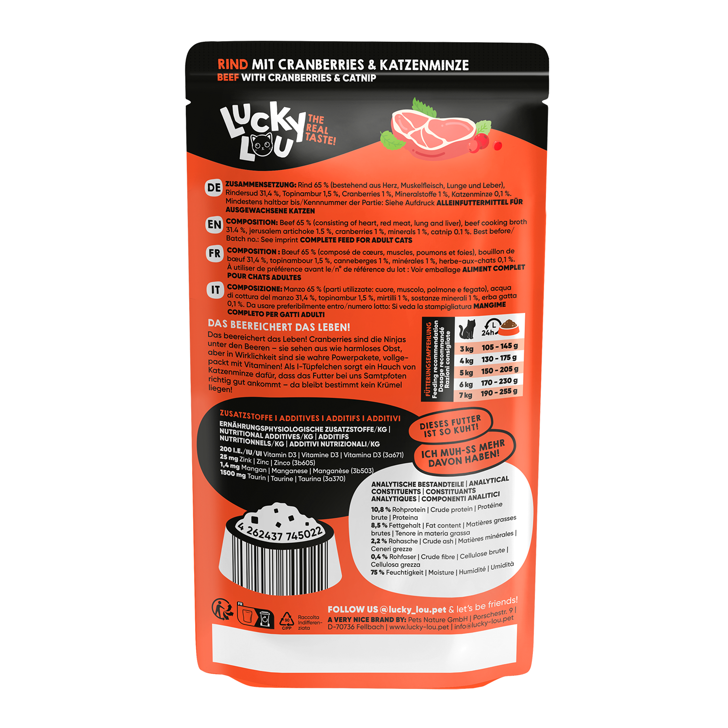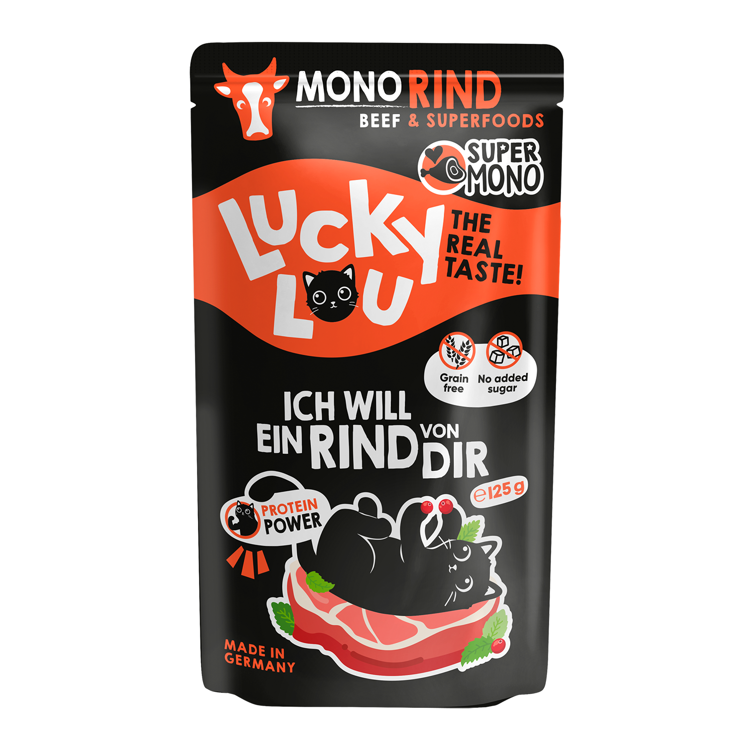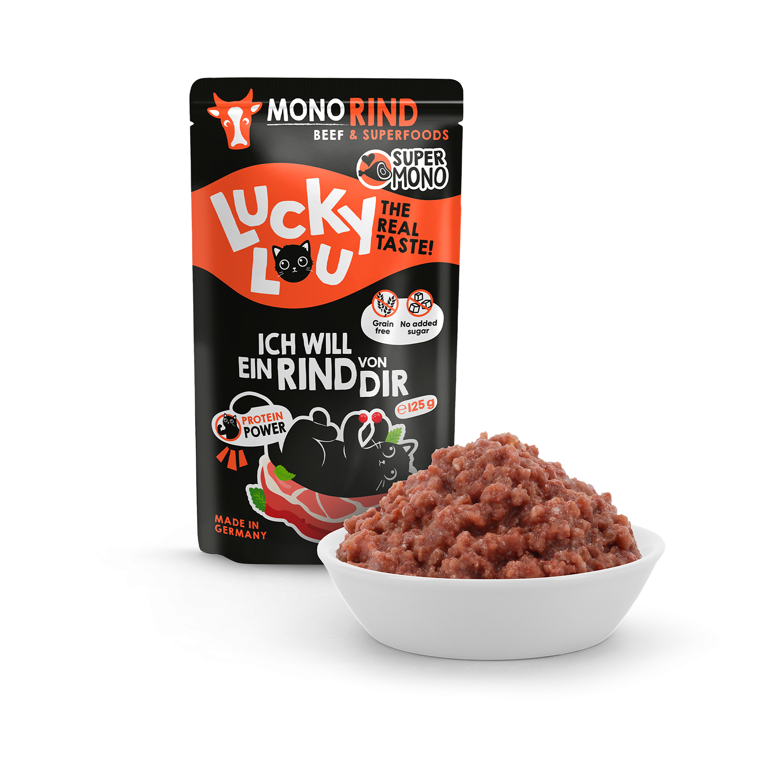 Lucky Lou® SuperMono Rind – die perfekte Wahl für ernährungssensible Katzen. Dieses hochwertige Nassfutter wurde speziell für Tiere mit empfindlicher Verdauung entwickelt und überzeugt durch sein Monoprotein-Konzept: Reines Rindfleisch als einzige tierische Proteinquelle sorgt für beste Verträglichkeit. Dank sorgfältig ausgewählter Zutaten und dem Verzicht auf unnötige Zusatzstoffe erhält deine Katze genau das, was sie braucht – nicht mehr und nicht weniger. Die feine Rindfleisch-Rezeptur ist besonders schmackhaft und leicht verdaulich. Lucky Lou® SuperMono Rind ist ideal für alle Katzenbesitzer, die auf Qualität, Transparenz und Verträglichkeit setzen.