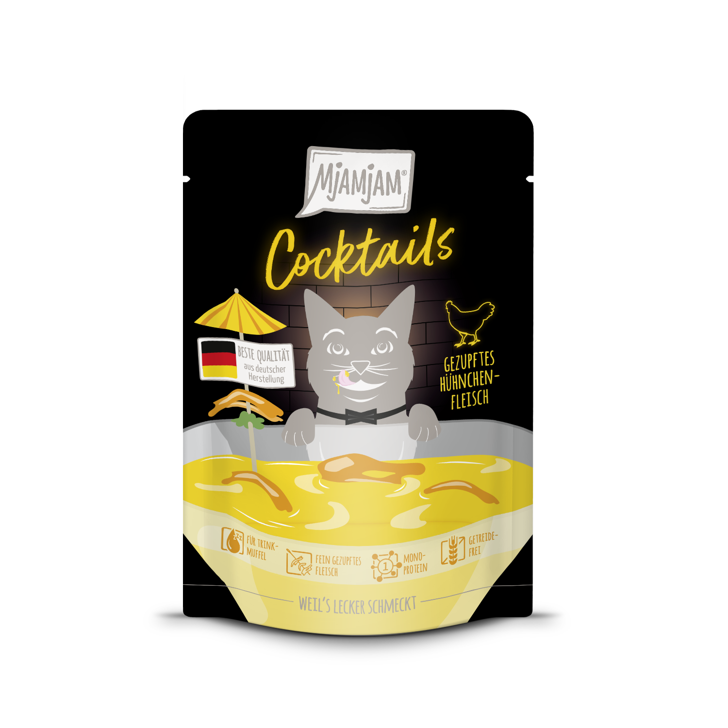 Ein kräftiger Schluck für starke Miezen: MjAMjAM Cocktails – Gezupftes Rindfleisch bringt intensive Aromen und sorgt für ein unverwechselbares Geschmackserlebnis. Deine Katze wird diesen Drink aus kräftiger Brühe und fein gezupftem Fleisch lieben und ganz nebenbei ihren Flüssigkeitshaushalt verbessern.