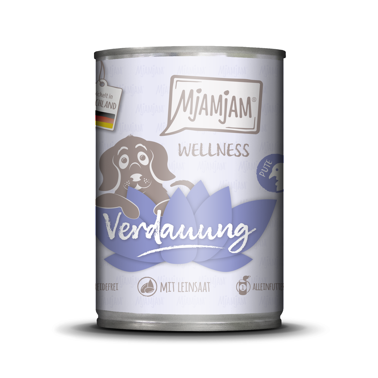 Sanfte Streicheleinheiten für´s Hundebäuchlein garantiert dieses leckere Monoprotein-Alleinfutter. MjAMjAM Wellness Verdauung bringt mit Leinsaat das Verdauungs-Chakra in Balance und den Hundegeist ins Gleichgewicht.