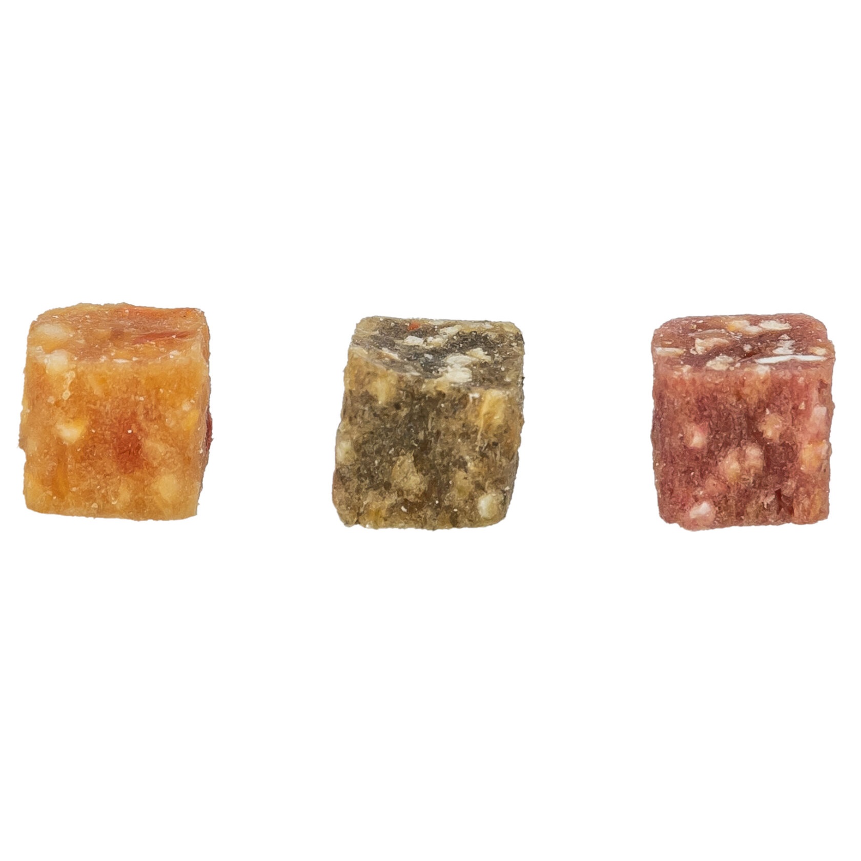 Süßkartoffel (60 %), Mais (18 %), Glycerin, Banane (3 %), Karotten (3 %) / lila Kartoffel (3 %), Hafer (3 %) / Seealgen (3 %), Spinat (3 %), Sojaprotein, Hefen, vegan, 0 % Zuckerzusatz
